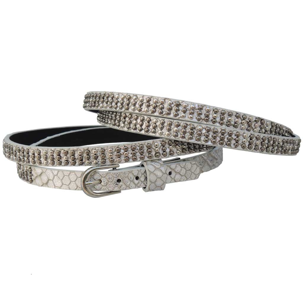 1 Paar Schuhgürtel zum Wickeln aus Kunstleder in Schlangenleder-Optik mit kleinen Nieten in silber und gunmetal. Durch eine Gürtelschließe sind die Stiefelbänder variabel in der Länge einstellbar.
